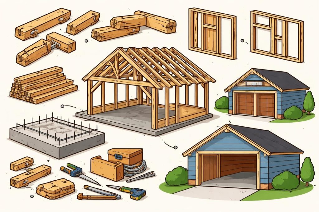 A typical timber frame garage kit includes several essential elements: