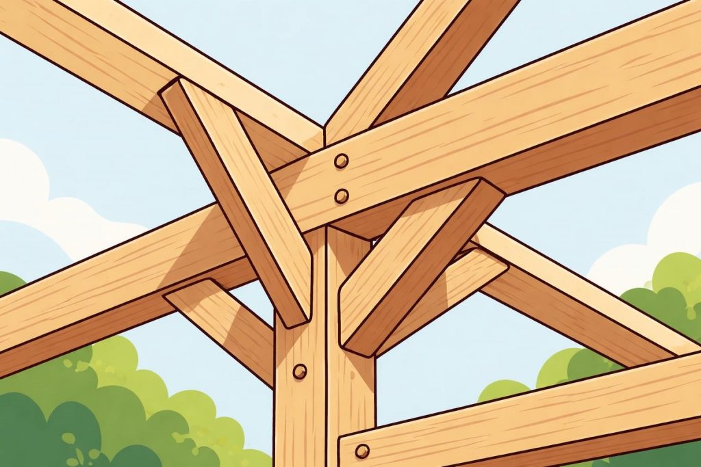 Between principal rafters, common rafters or trusses carry roof covering loads. The timber frame structure detail in this secondary framing often utilizes lighter timber sections, supported at regular intervals by purlins running parallel to the ridge. This arrangement creates efficient load paths whilst minimizing material usage.